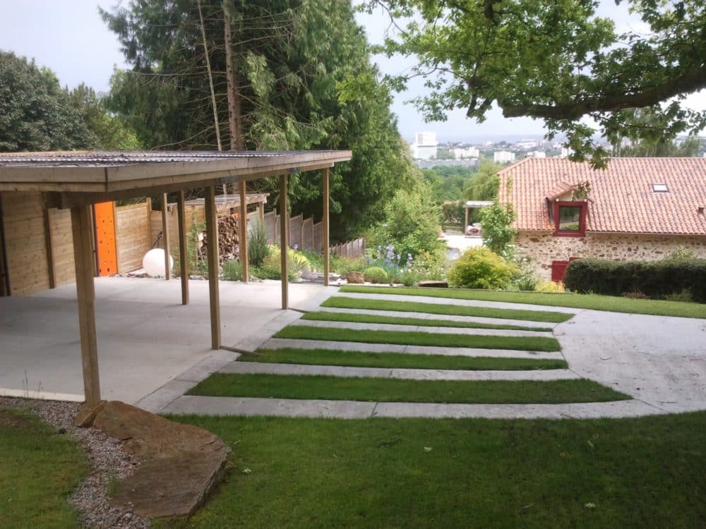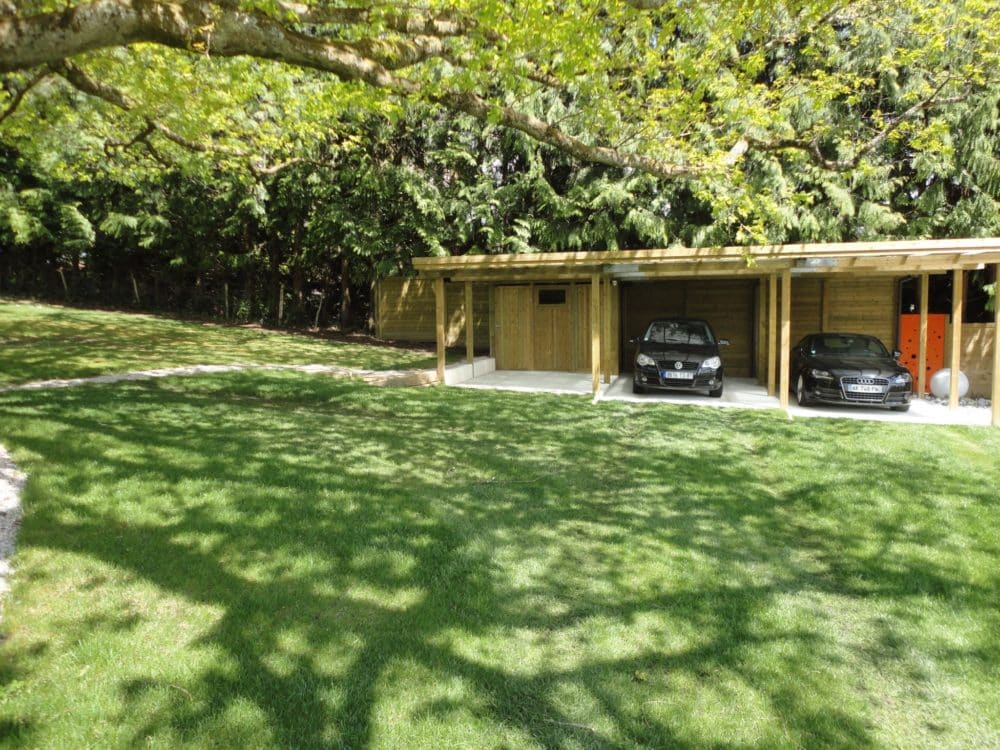 Un abri véhicules en bois, Gardival, au premier plan et la pergola ombragée en bout de piscine dans le fond surplomblent la ville.