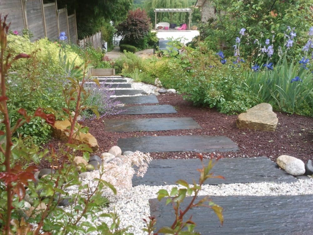 Une série de dalles d’ardoises compose un pas japonais qui vient relier l’espace haut du terrain à l’espace intermédiaire.