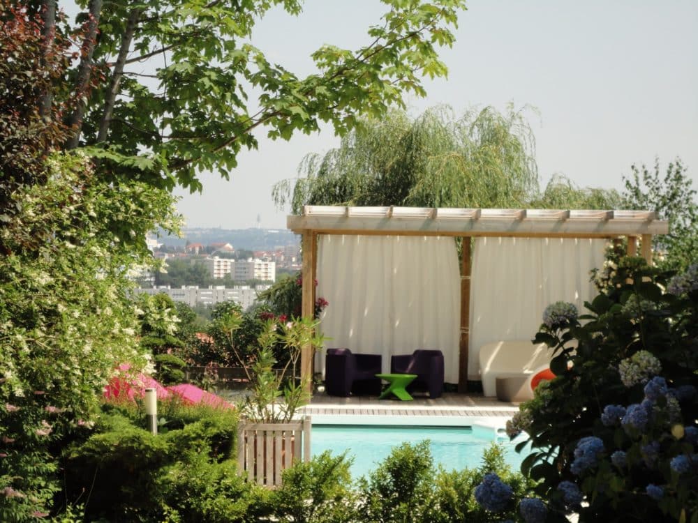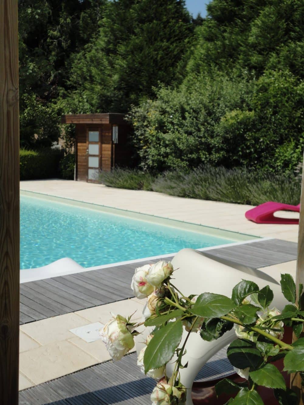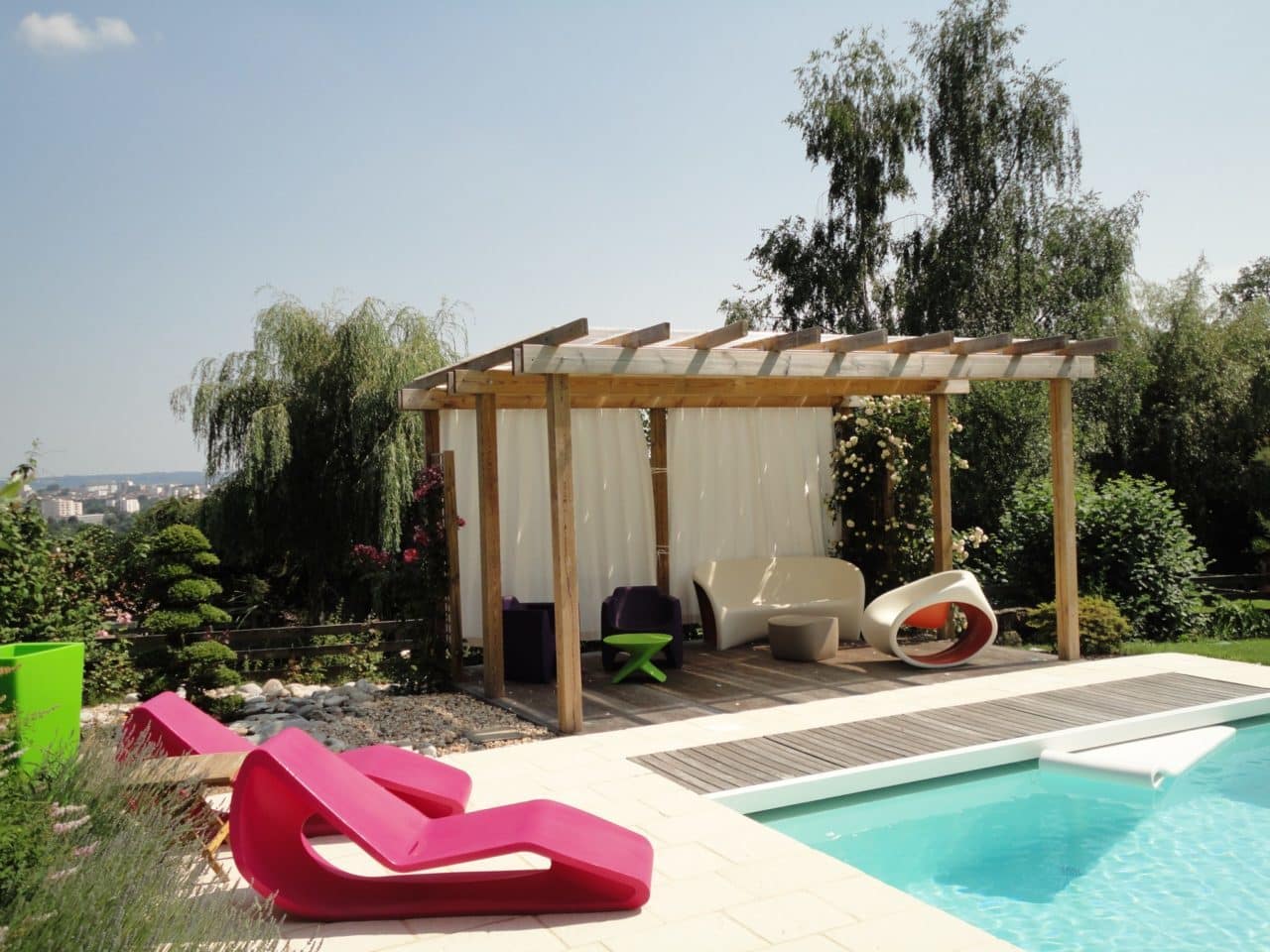 La piscine et la pergola sont nichés dans leur écrin de verdure.