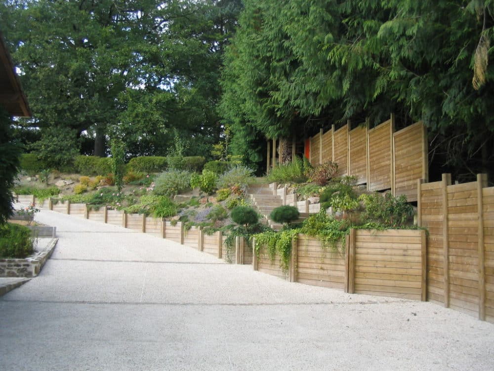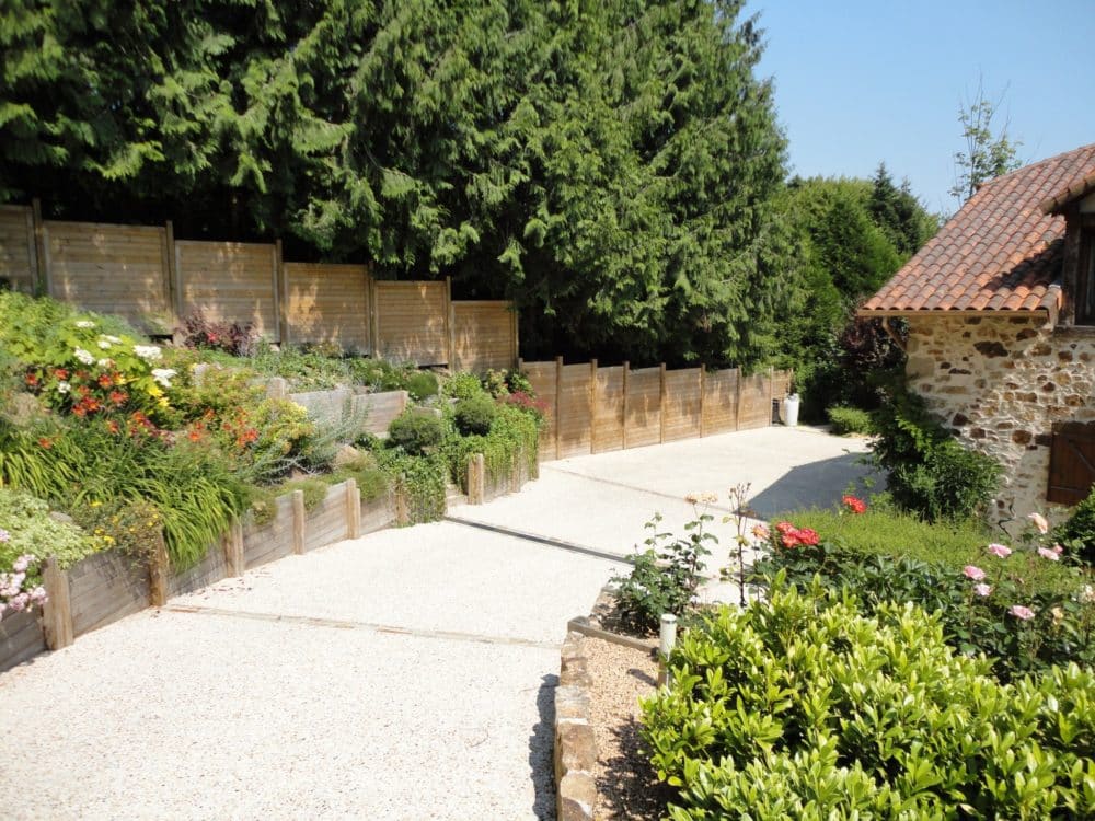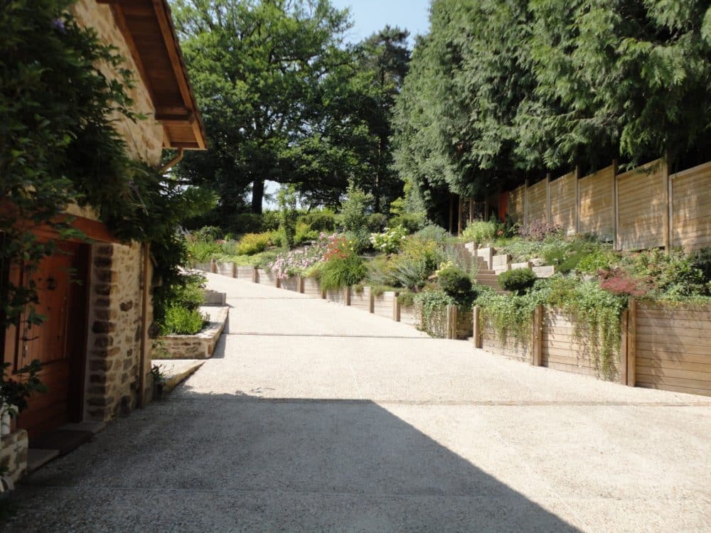 Entre les différentes terrasses, les pentes ont été maintenues par des soutènements en bois et végétalisées. L’allée en béton désactivé, durable et pratique s’intègre parfaitement à cet espace champêtre.