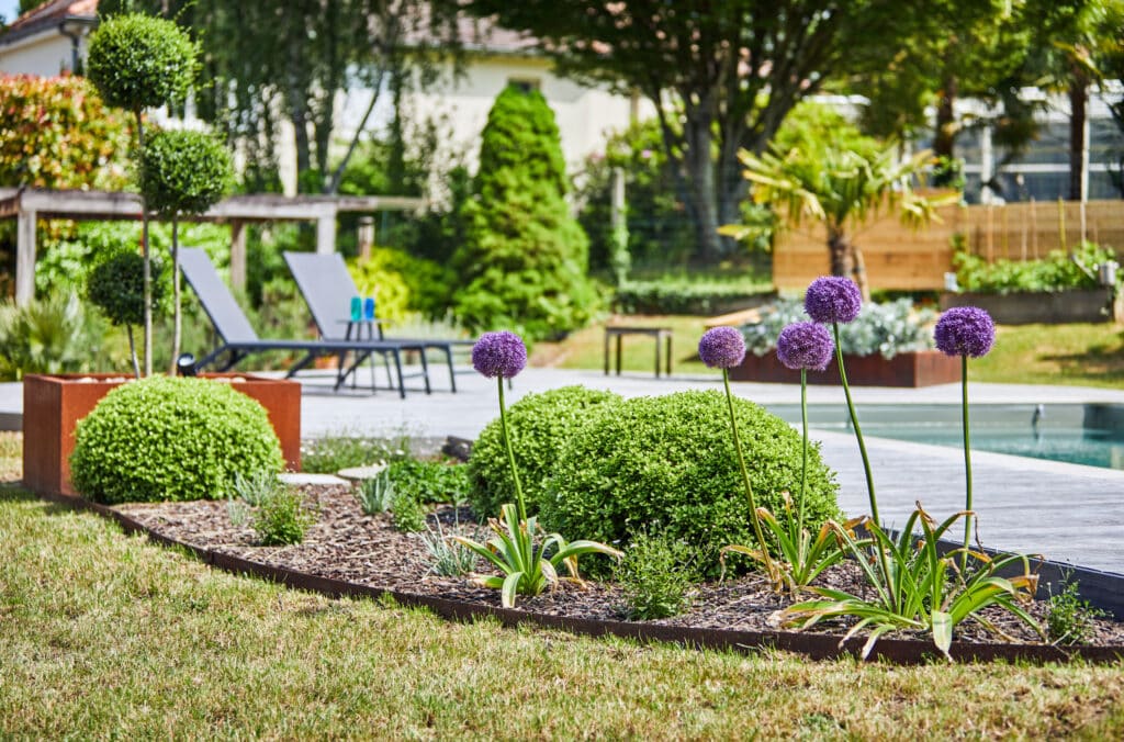 Ce jardin met en valeur une association harmonieuse de matériaux naturels : corten, bois et pierre se déclinent en teintes douces et authentiques, invitant à la détente.