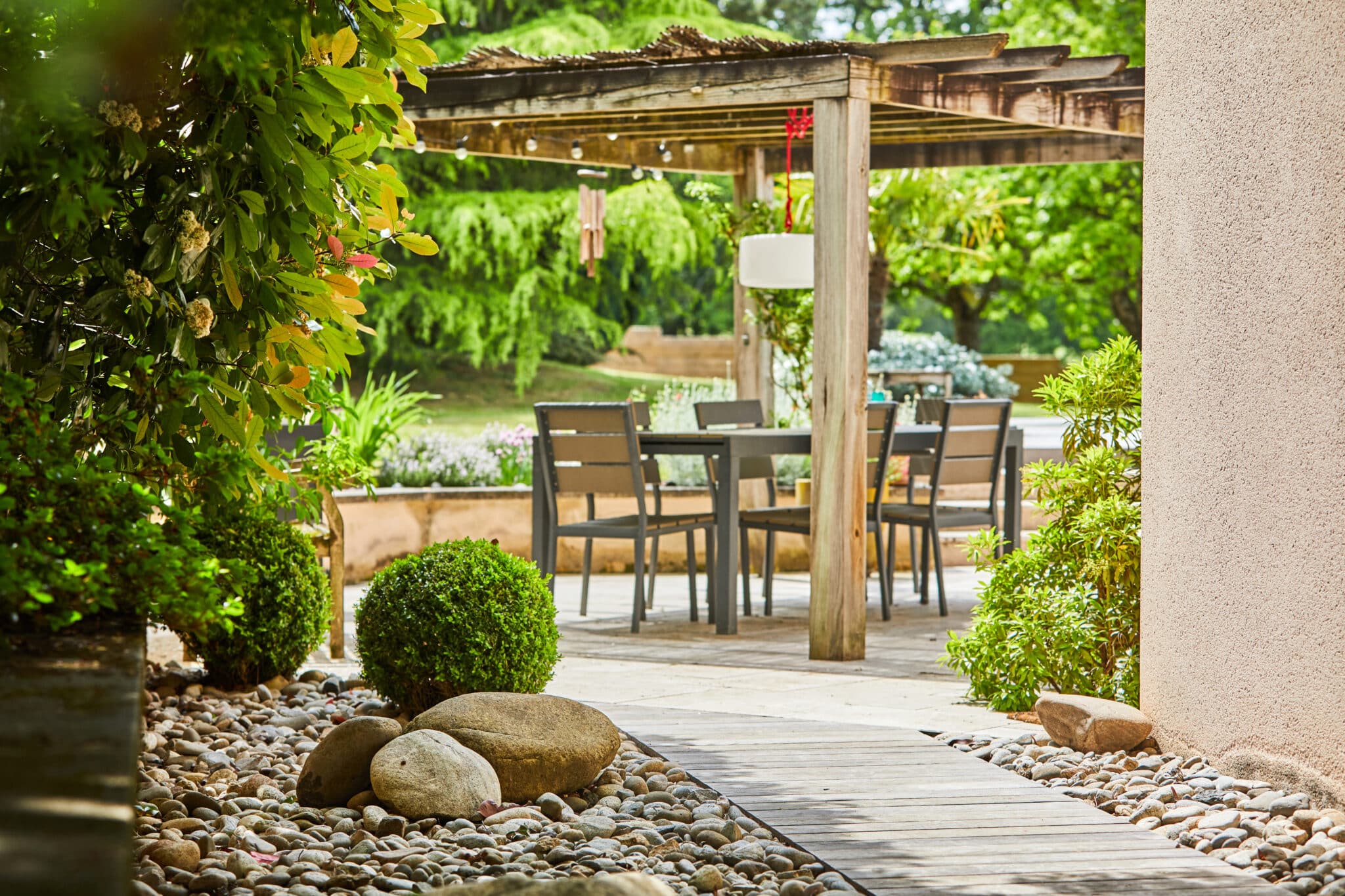 Pergola, terrasse et escalier s’intègrent parfaitement dans un cadre végétal propice aux moments de convivialité.