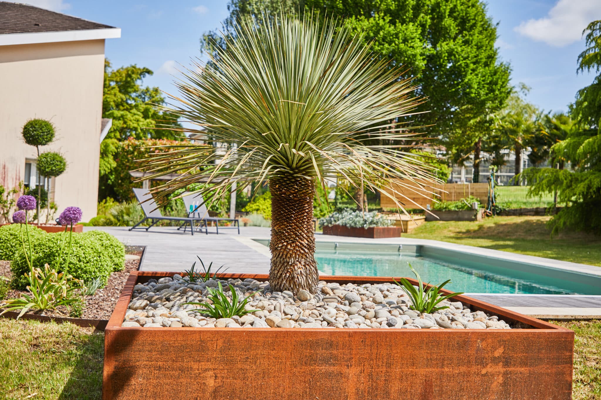 Ce jardin met en valeur une association harmonieuse de matériaux naturels : corten, bois et pierre se déclinent en teintes douces et authentiques, invitant à la détente.