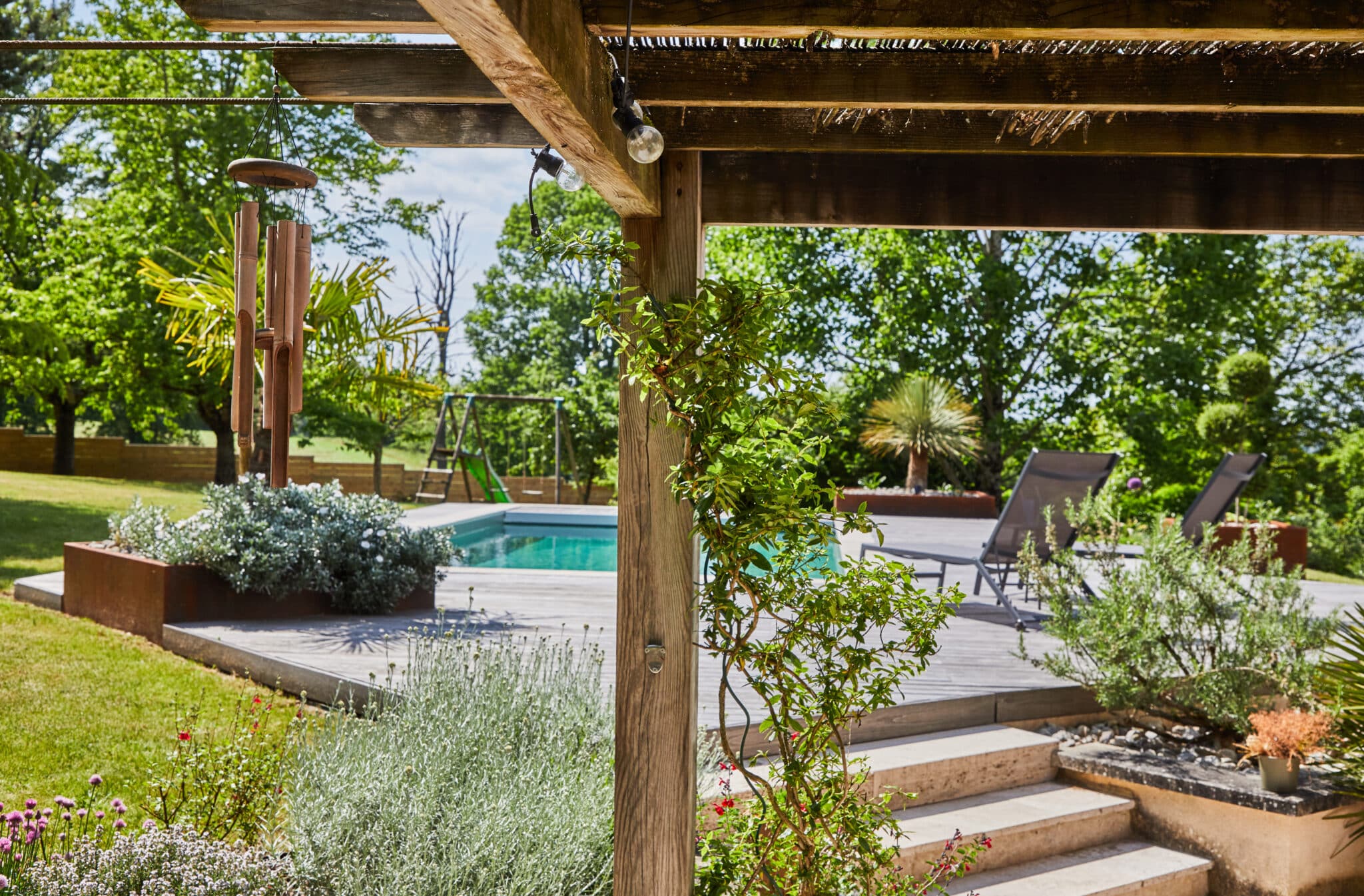 Pergola, terrasse et escalier s’intègrent parfaitement dans un cadre végétal propice aux moments de convivialité.
