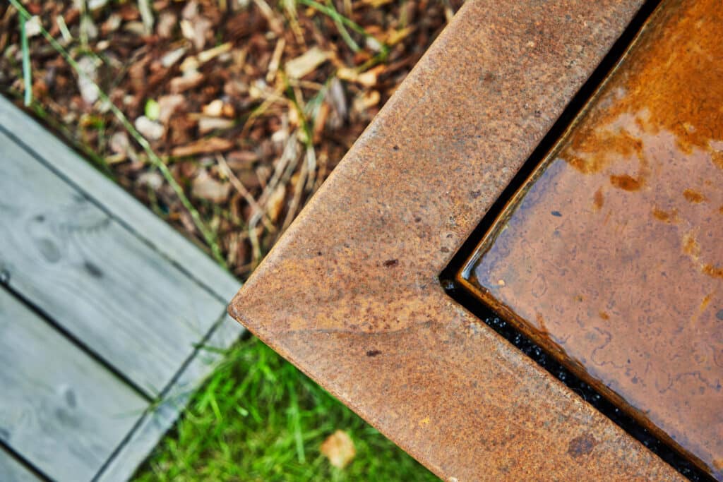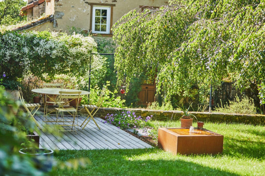 Cette réalisation globale comprend une terrasse en bois, une allée en pas japonais, une fontaine et des soutènements en acier corten.