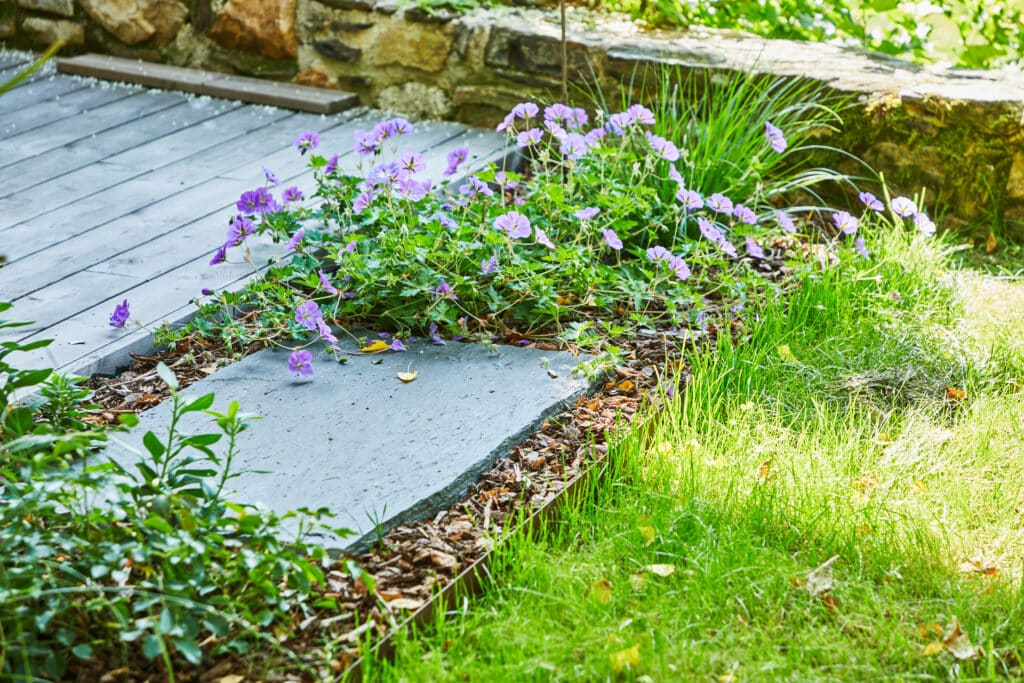 Cette réalisation globale comprend une terrasse en bois, une allée en pas japonais, une fontaine et des soutènements en acier corten.