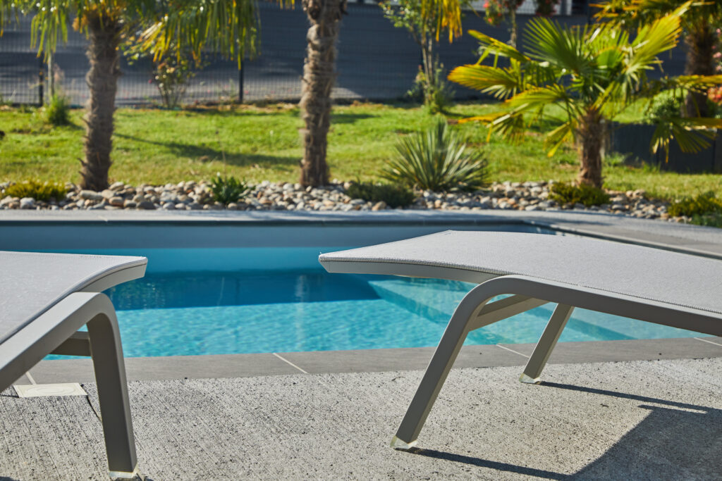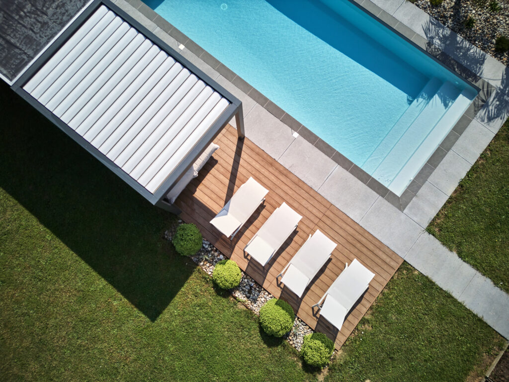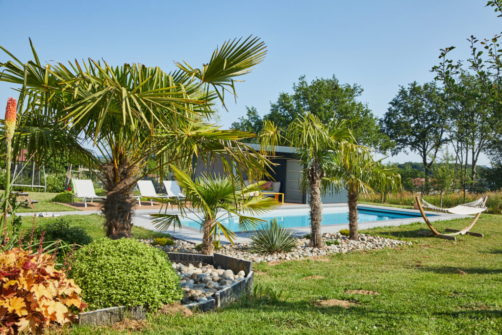 Ce jardin moderne joue sur des lignes épurées et des matériaux contemporains. Poolhouse élégant, terrasse en bois, tour de piscine en béton et végétation soigneusement intégrée créent un espace harmonieux.