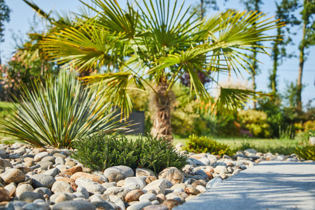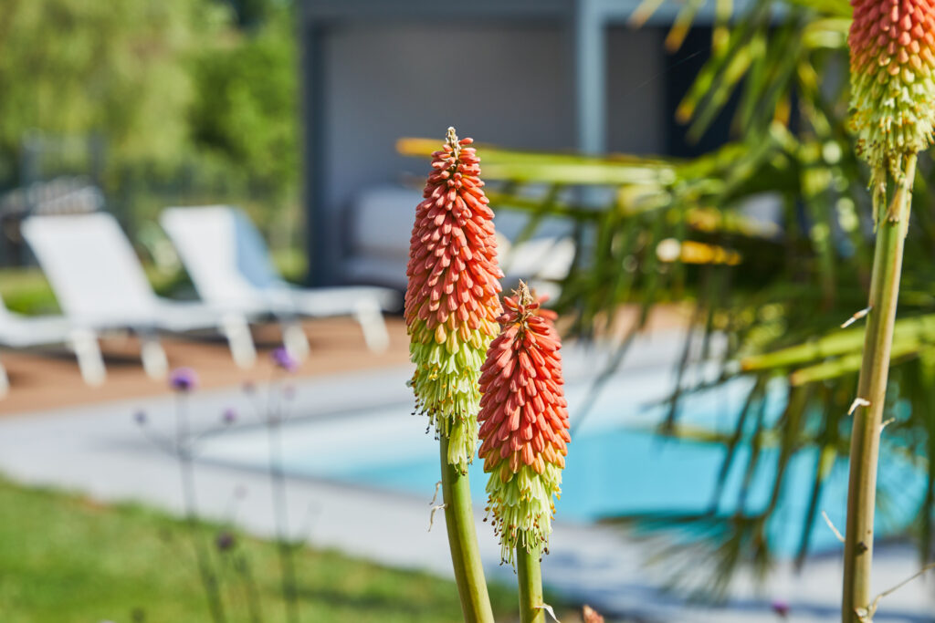 Ce jardin moderne joue sur des lignes épurées et des matériaux contemporains. Poolhouse élégant, terrasse en bois, tour de piscine en béton et végétation soigneusement intégrée créent un espace harmonieux.