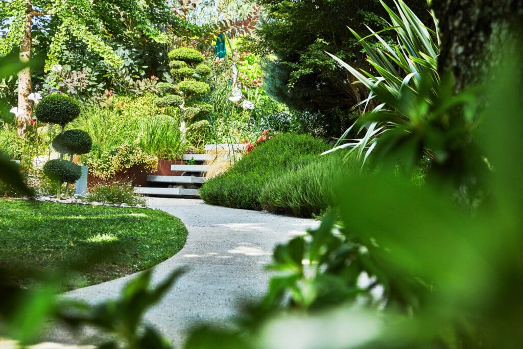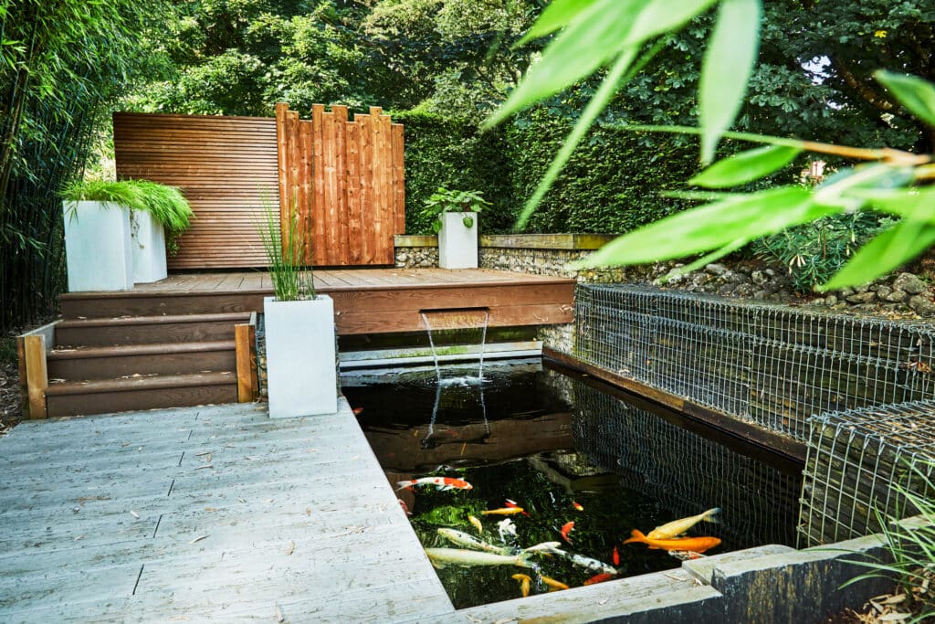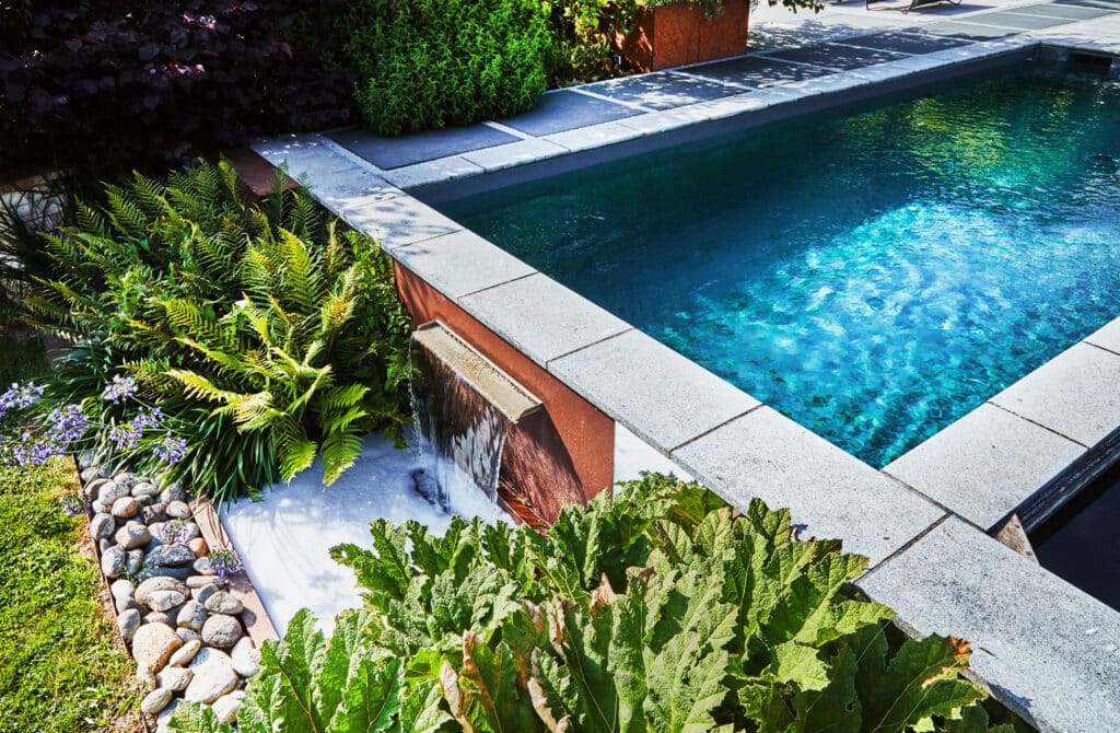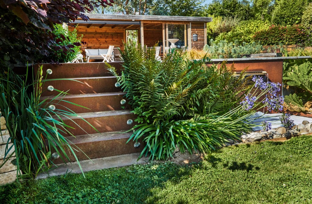 Les aménagements paysagers qui font le charme de notre jardin : bac et fontaine en acier corten, soutènement en pierres et corten, structure abri jardin bois, plantations, piscine, escalier en suspension, bassin d’agrément etc.
