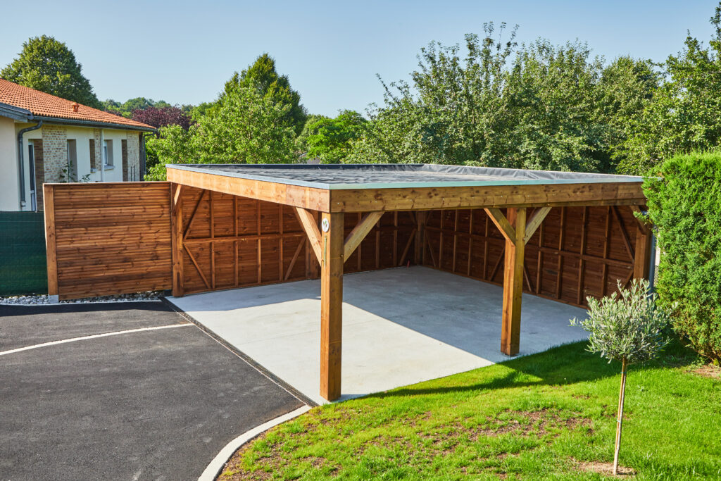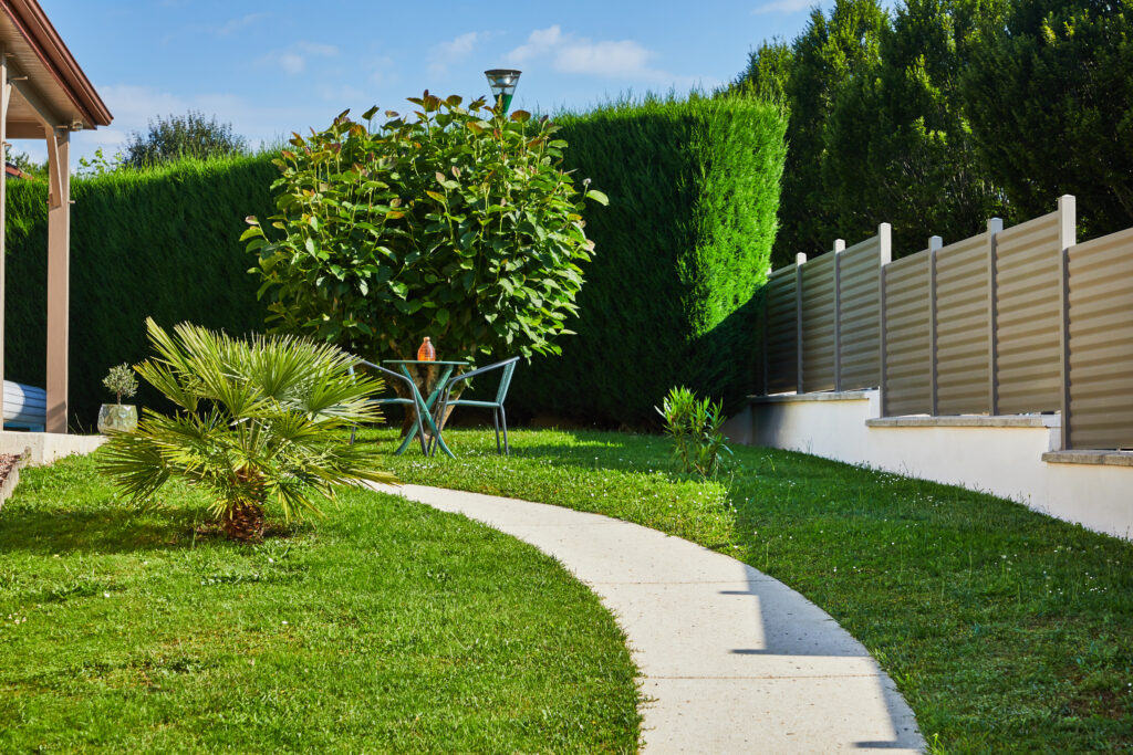 Le charme de jardin est créé par : des allées en béton érodé, une clôture en aluminium, une terrasse en composite, un carport, un portail et un tour de piscine en pavés. L’ensemble de ces éléments permettent de créer un espace extérieur structuré et fonctionnel.
