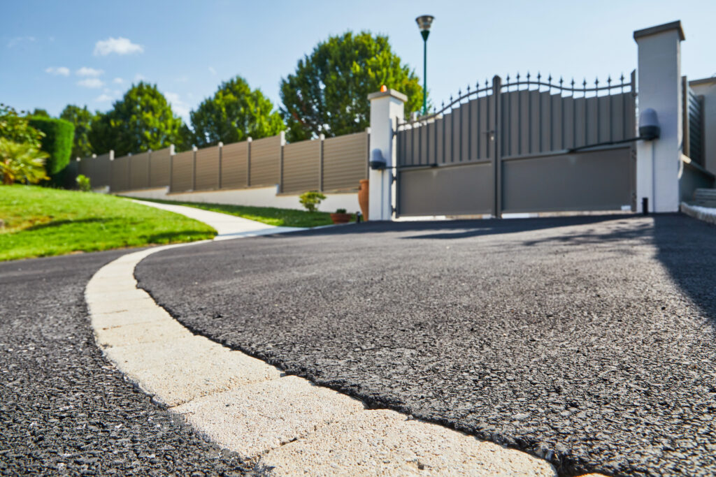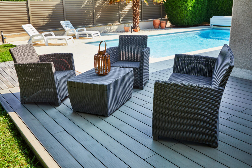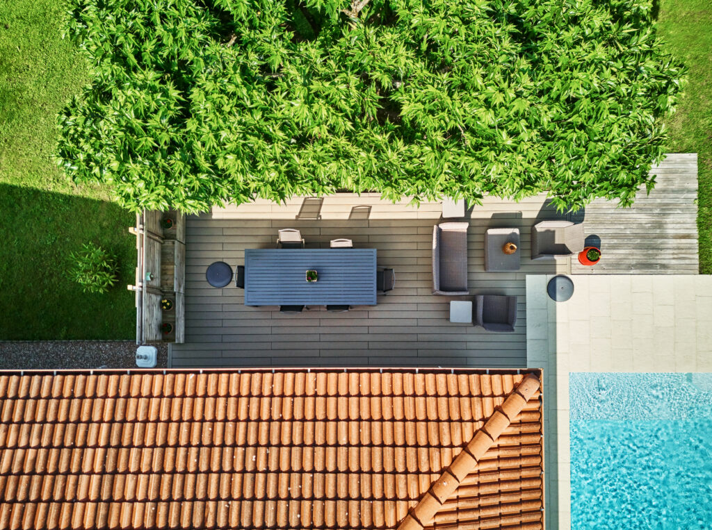 Le charme de jardin est créé par : des allées en béton érodé, une clôture en aluminium, une terrasse en composite, un carport, un portail et un tour de piscine en pavés. L’ensemble de ces éléments permettent de créer un espace extérieur structuré et fonctionnel.