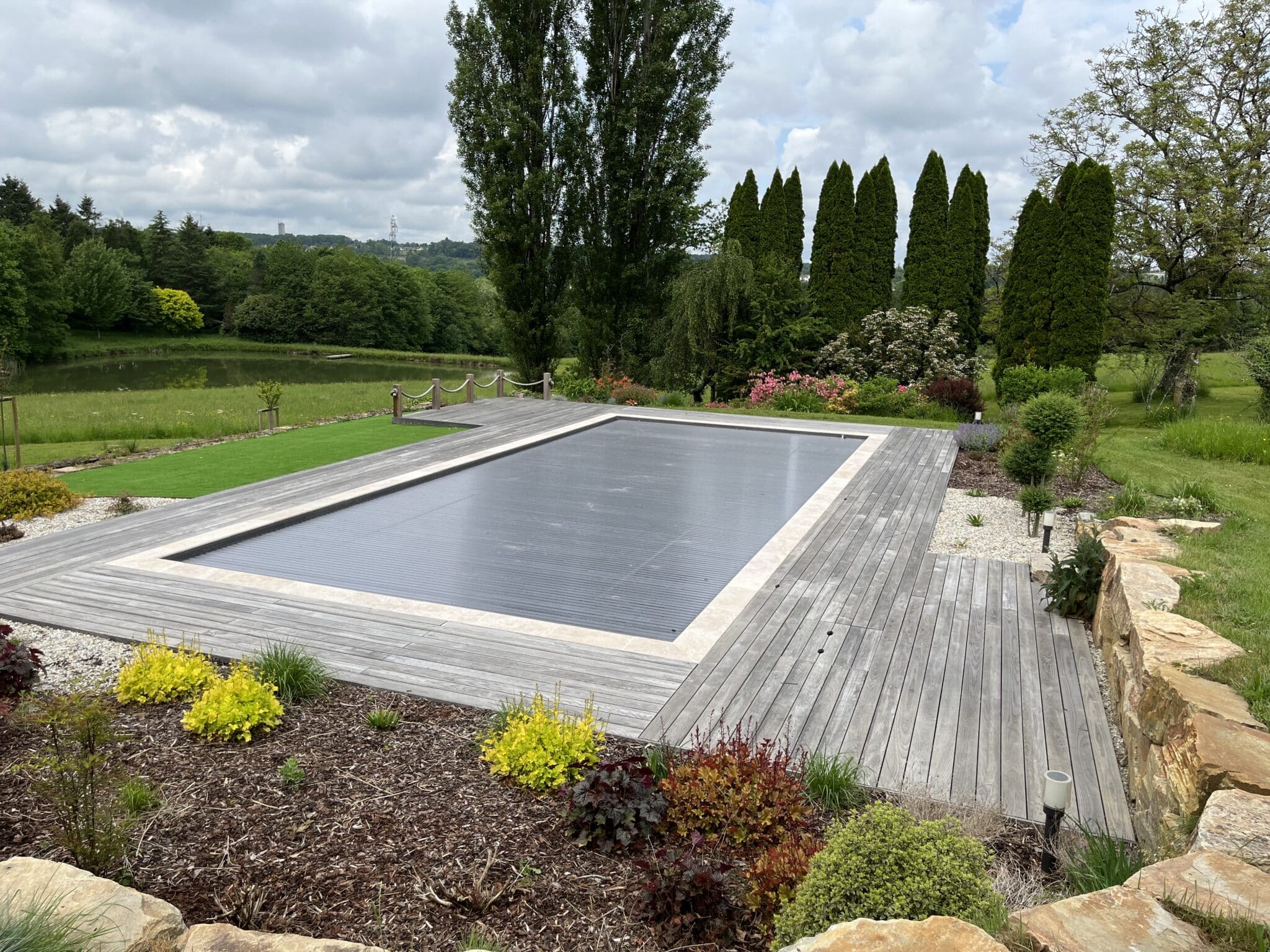 Aménagement tour de piscine bois, végétalisation et pas japonais schiste