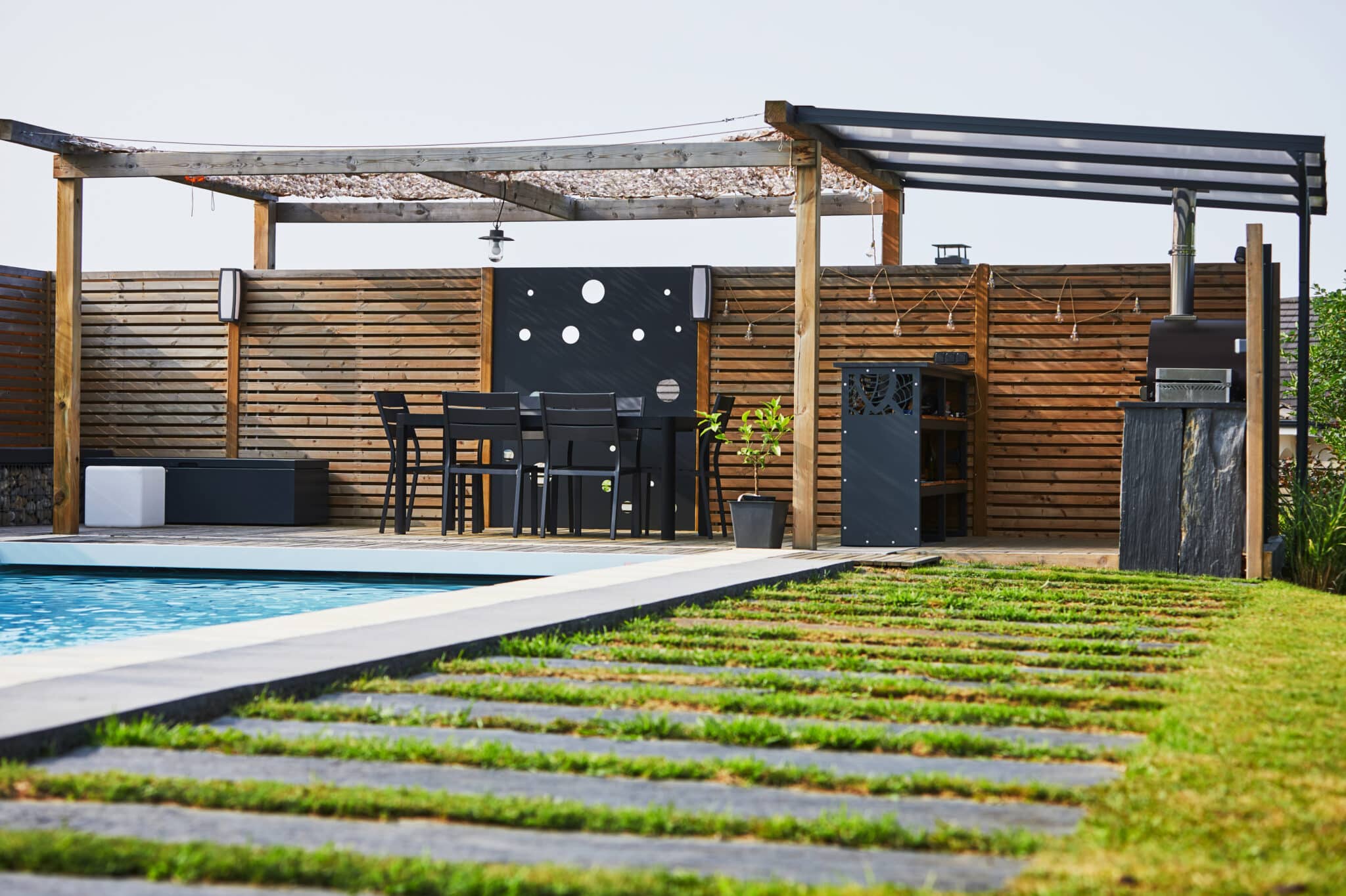 Aménagement tour de piscine, pas japonais schiste et cuisine d’été